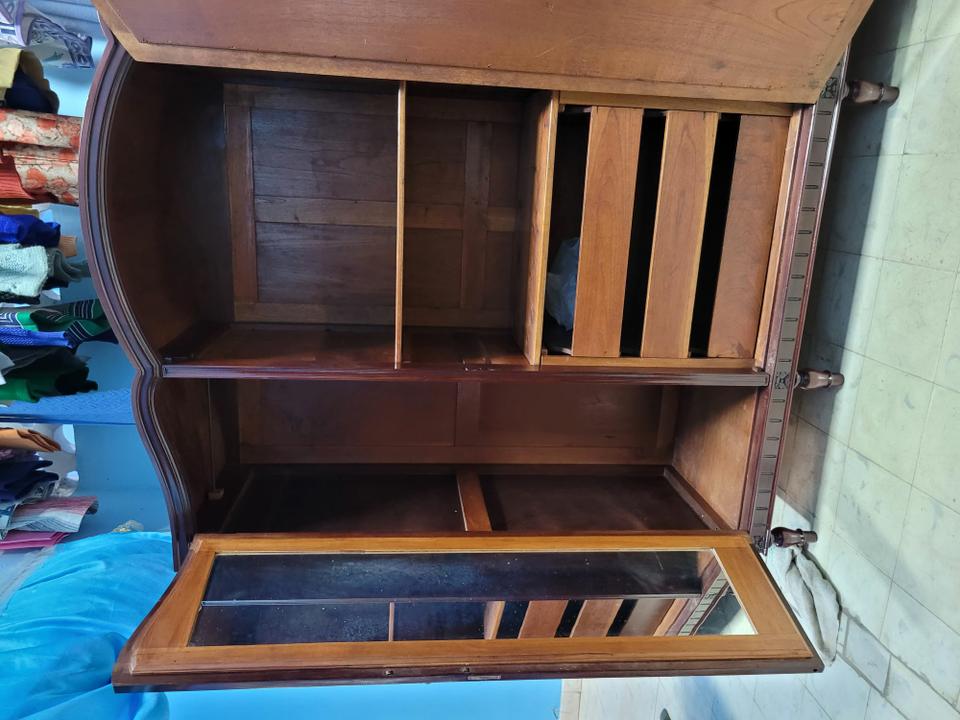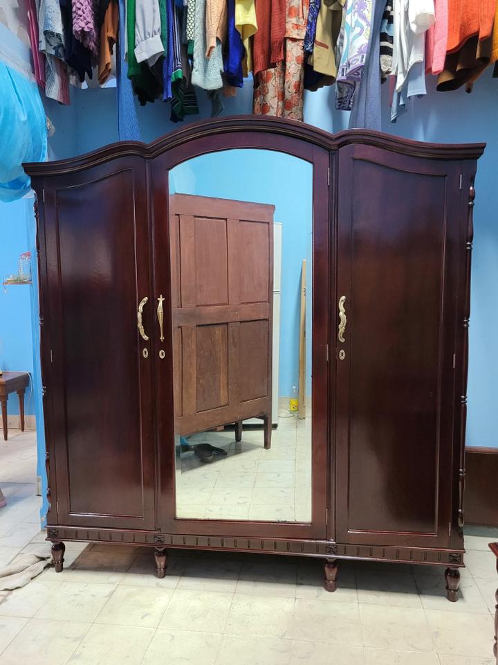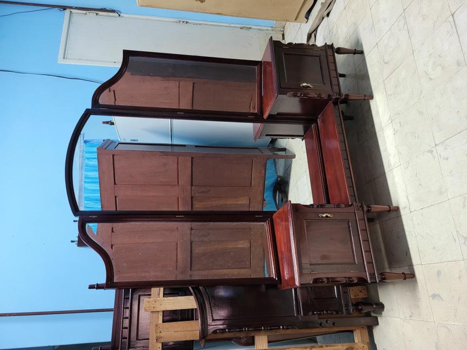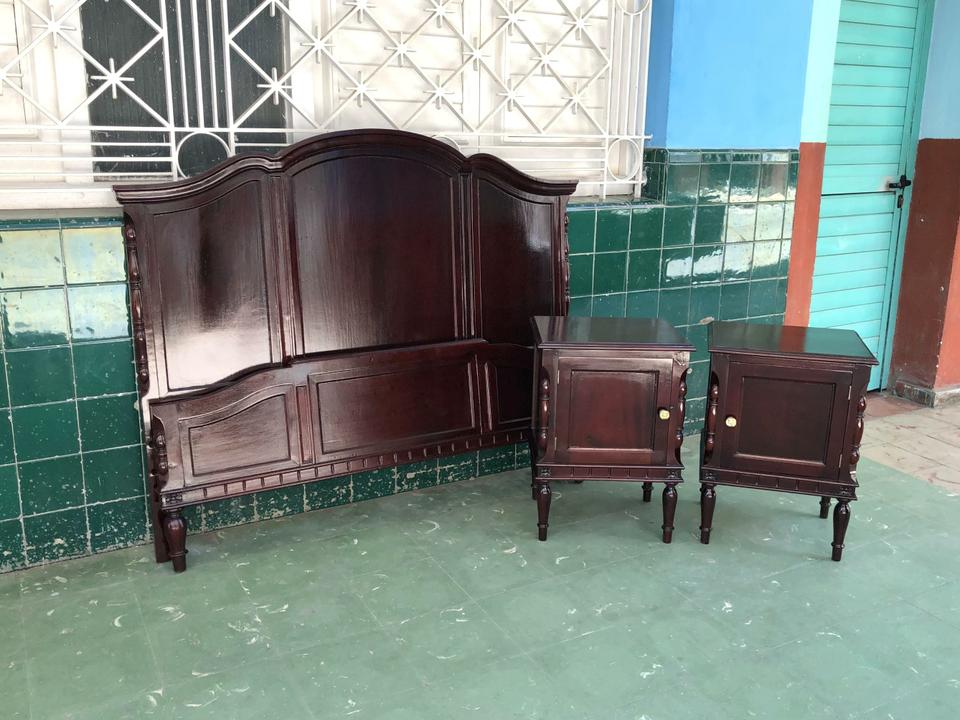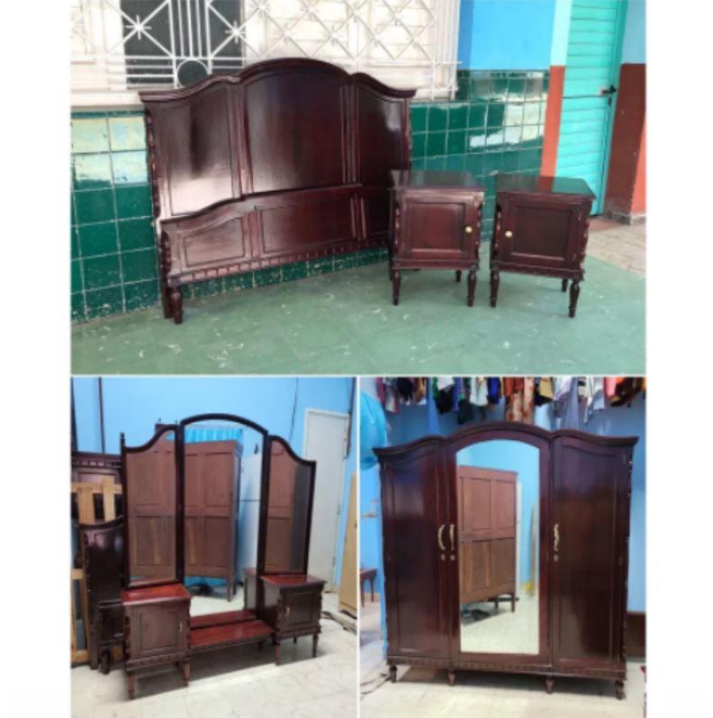 Juego de cuarto estilo Colonial acabado de restaurar. Cuenta con: Cama camera con sus dos mesitas de noche y bastidor, Escaparate (espejos interiores en los laterales y tres gavetas en el centro) y Trilunio.