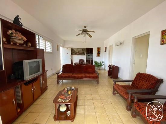 El apartamento cuenta con un pasillo tipo balcón, enrejado, desde el cual se accede a la vivienda, cuarto de desahogo y escalera de acceso a la azotea. La vivienda consta de sala-comedor muy amplia, cocina, pequeño patio de servicio con lavadero, dos habitaciones amplias de 4x4, ambas con closet y un baño intercalado, pudiendo acceder a este desde ambas habitaciones y terraza amplia con toldos puestos y enrejada, con vista a la avenida.