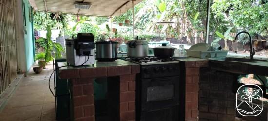Cuenta con jardín, portal , carpoch, garaje, dos habitaciones y una pequeña con baño, baño amplio pasillo, sala comedor amplio, terraza, terraza trasera con tejas y aceras amplias en los laterales techadas, lavadero cisterna, cocina y baño exteriores, cuarto de desahogo, casa para perro con placa y patio de tierra con árboles frutales.