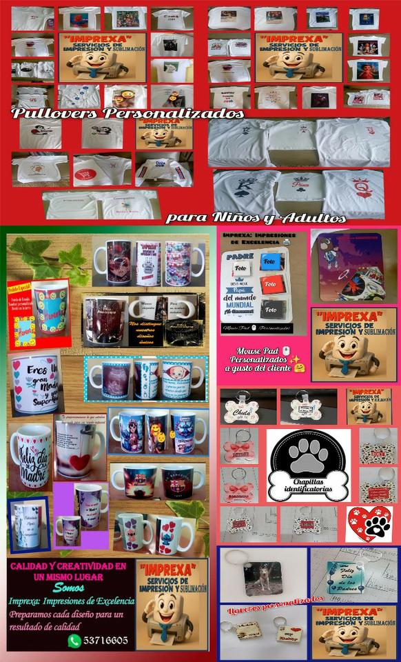 Tambien prestamos el servicio de Etiquetas (para los envases o personalizar sus productos (con calidad fotografica incluso) y de Articulos Personalizados (Jarras de distintos modelos, Pullovers (solo en color blanco), Mouse Pad, Bolsas y Llaveros.