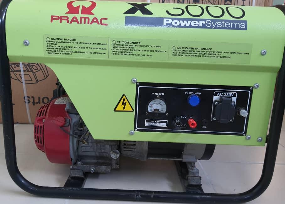 Generador de electricidad italiano Pramac X-3000 de 3000 Watt de potencia. Tiene motor Honda GX 160. Genera corriente alterna de 230 V monofásica y corriente directa de 12 V. Funciona con gasolina. El depósito lleva 14 litros de combustible, genera 1 hora por litro, por lo que con el tanque lleno puede funcionar 14 horas. La planta es nueva, nunca se ha usado, sólo se utilizó cuando se compró para probarla. Pago al contado en Euro 900.00.