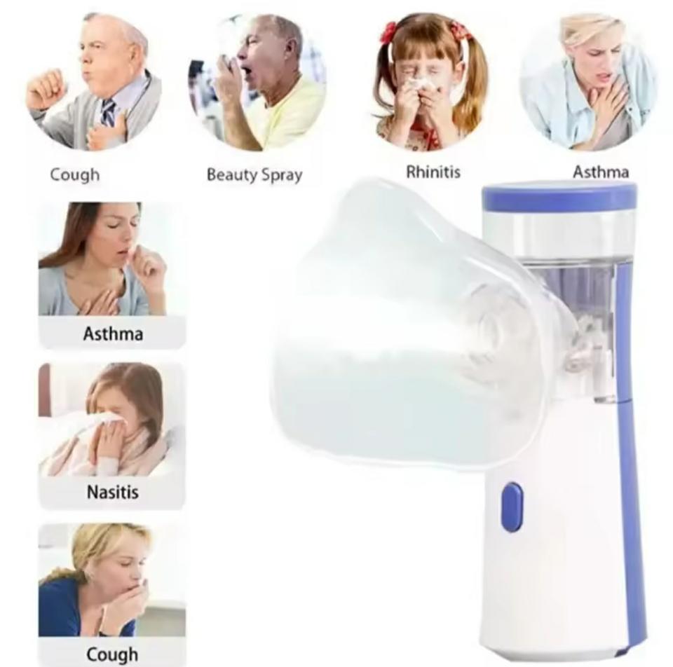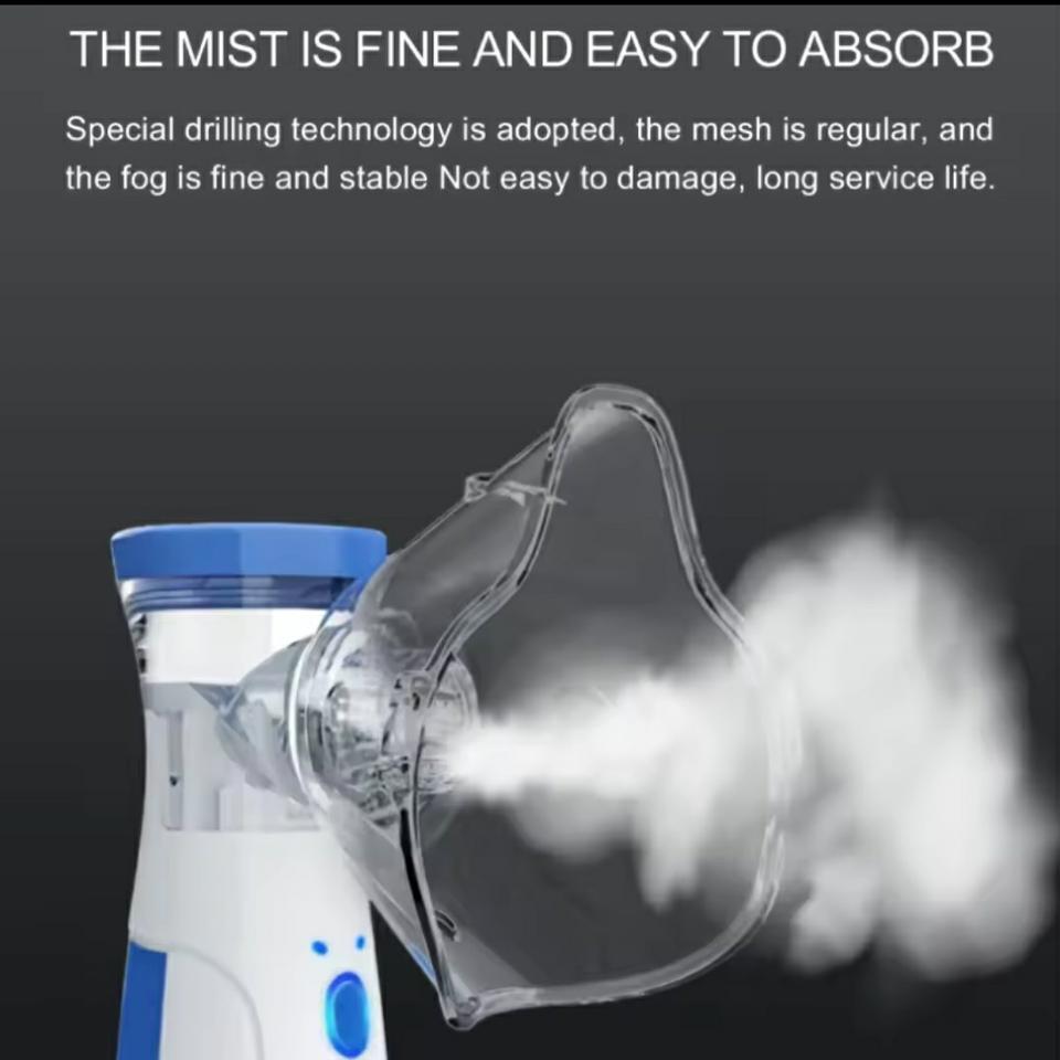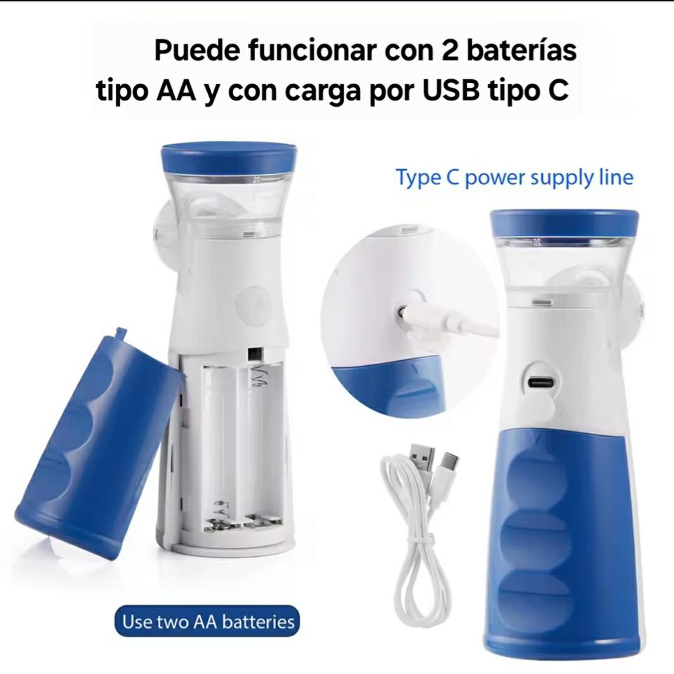 Nebulizador de soluciones para el tratamiento de afecciones de nariz y garganta. Alimentación por cable Usb o batería (no se proporciona). Tres niveles de nebulización. No sé activa hasta estar correctamente cerrado.
